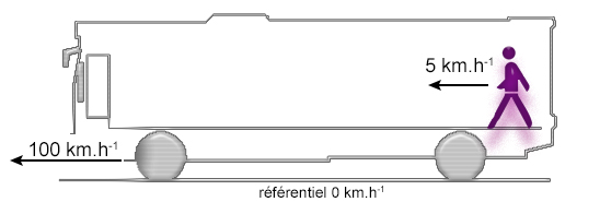 Si l'on se trouve dans un autobus qui se déplace à une vitesse de 100 km.h-1 sur une autoroute, lorsque l'on marche de l'arrière vers l'avant à une vitesse de 5 km.h-1 . On se déplace à 105 km.h-1 par rapport au référentiel terre et à 5 km.h-1 par rapport au référentiel autobus. Le mouvement de la personne qui se déplace peut-être étudié en fonction de trois axes, définis : par rapport à l'autobus qui n’est pas un référentiel galiléen, ou bien par rapport à la terre considérée comme un référentiel galiléen.